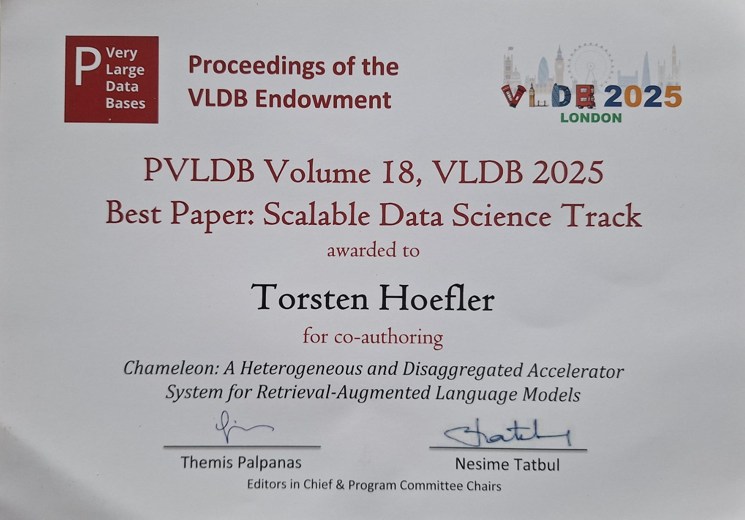 Torsten Hoefler's Webpage - Awards ACM Prize in Computing (2025) 2025 VLDB Best Paper in Scalable Data Science Track with W. Jiang, G. Alonso Ultra Ethernet Consortium - Visionary Leadership Award 2025 2024 Best Paper Award at ACM/IEEE Supercomputing (SC24) with S. Shen, L. Huang, M. Chrapek, T. Schneider, J. Dayal, M. Gajbe, and R. Wisniewski 2024 Best Poster Award at ACM/IEEE Supercomputing (SC24) with M .Copik, A. Calotoiu, P. Zhou, L. Tobler 2023 Best Student Paper Award and Best Reproducibility Advancement Award at ACM/IEEE Supercomputing (SC23) with M. Chrapek and M. Khalilov Inaugural 2023 ISC Jack Dongarra Award https://www.isc-hpc.com/press-releases/torsten-hoefler-earns-first-jack-dongarra-early-career-award.html https://inf.ethz.ch/news-and-events/spotlights/infk-news-channel/2023/04/torsten-hoefler-earns-first-jack-dongarra-early-career-award.html 2022 IEEE CS Sidney Fernbach Award https://www.computer.org/press-room/2022-news/hoefler-receives-ieee-cs-sidney-fernbach-award https://ethz.ch/en/news-and-events/eth-news/news/2022/10/torsten-hoefler-receives-the-sidney-fernbach-award-2022.html “for application-aware design of HPC algorithms, systems and architectures, and transformative impact on scientific computing and industry.” 2022 Best Paper Award ACM/IEEE Supercomputing (SC22) with M. Besta and others 2022 Best Reproducibility Advancement Award ACM/IEEE Supercomputing (SC22) with M. Besta and others 2022 Indiana University Luddy Distinguished Alumni Award
